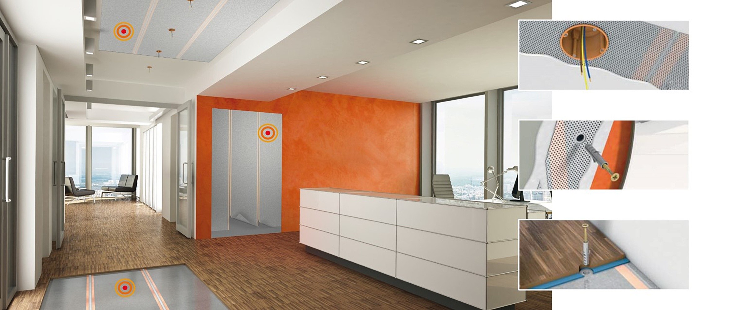 For reception areas our higher wattage FLEECE system can either be discreetly hidden away behind a display wall to radiate out towards the reception desk or can be cleverly integrated within designer plinths or bulkheads.