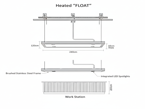 The Energy Carbon infrared FLOAT system is a bespoke hanging platform with integrated lighting designed to hang above work stations, trade counters and retail areas. Triggered by timers and occupancy sensors and running on safe 36v AC these units can be wired back to secure cupboards so that the electrical heating can be safely used in areas with potential combustion issues.