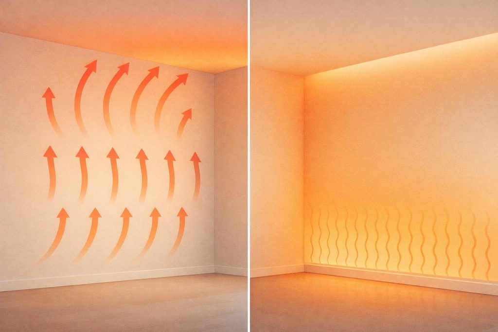 Traditional radiators and forced-air systems heat the air, which rises and often creates uneven temperature zones. However, infrared heating warms surfaces directly, which helps reduce cold spots. In addition, there is less air movement, which can reduce drafts and make indoor comfort feel more consistent.
